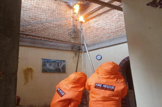 Kuok ; Tim rescue Dinas Pemadam Kebakaran dan Penyelamatan Kab. Kampar evakuasi sarang tawon jenis Vespa yang bersarang di dalam rumah Nurlaili yang b...